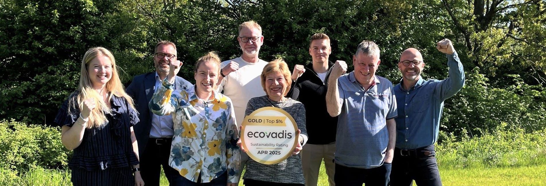 Mekoprint’s sustainability group and the new gold rating from Ecovadis. From left: Inge-Marie K. Tang Donsig, Alex Laursen, Isabella Glad Wiberg, Mads Abildgård Nielsen, Ghita Bech, Daniel Capion Poulsen, Steen Pedersen, and Morten Kjær.