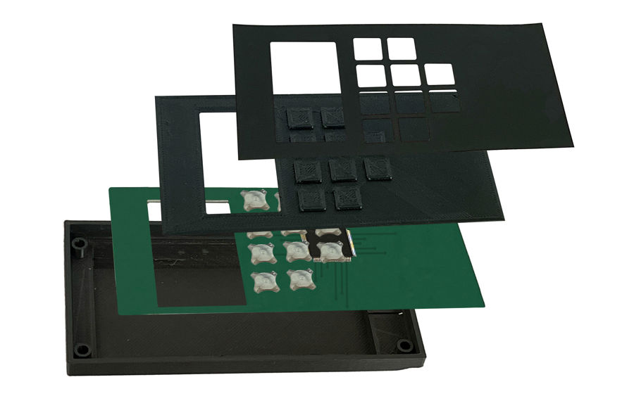 En mere kompleks løsning kunne omfatte flere funktionelle lag, som er indbygget i tastasturet og monteret på en housing, f.eks. EMC afskærmning, lysblok, osv.