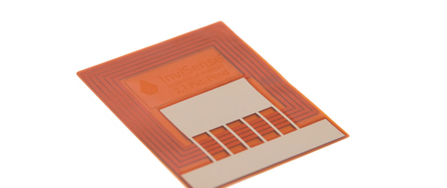 The sensor consists of etched cobber foil with silk screen printed electrically conductive circuits of silver and parts of lacquer and transfer tape. As a finishing process the printed sensor is punched into right dimensions. and delivered to InviSense as ready-made items. Packed and ready for application.